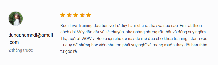 Mình học cùng Bee Academy từ những buổi live training cho tới các bài tập tự làm. Mình hay đùa rằng cô Mây có khả năng “tẩy não” rất giỏi, vì khi kết thúc khóa học mình không chỉ có thêm kiến thức và kỹ năng mà còn tự tin vào bản thân hơn, vượt qua nhiều giới hạn. Bee không chỉ là nơi học tập, mà còn là nơi kết nối mình với những đồng nghiệp và những người bạn vô cùng quý giá.