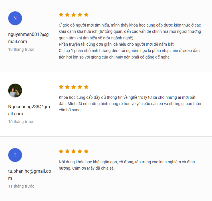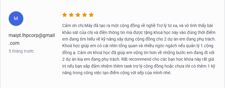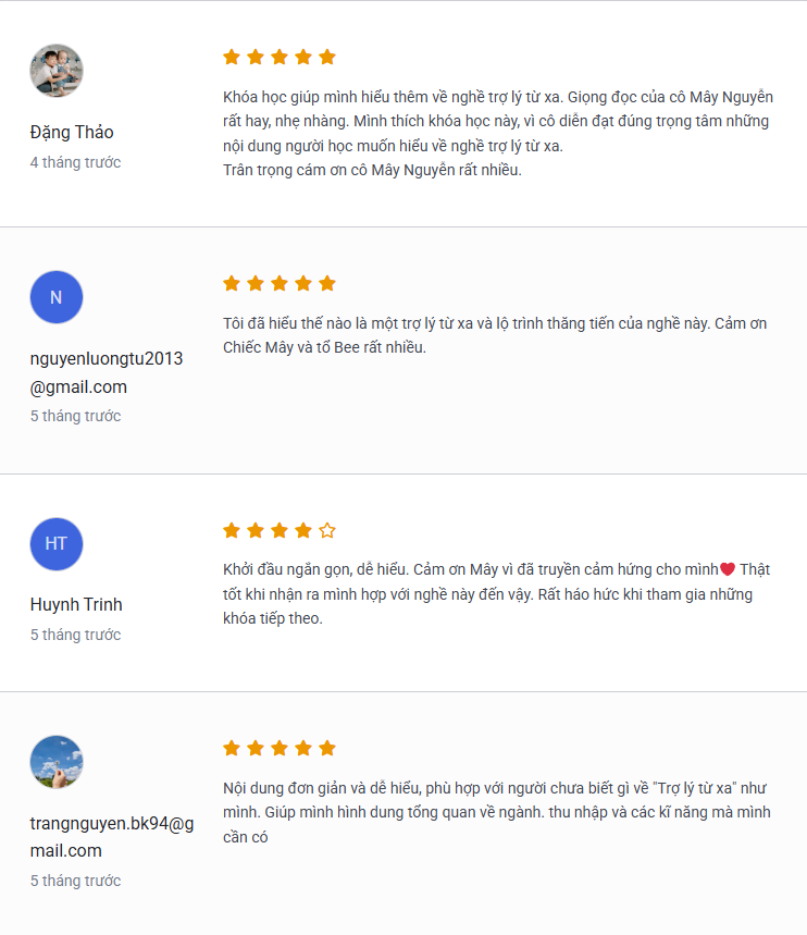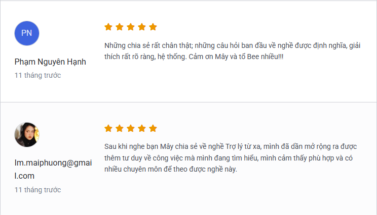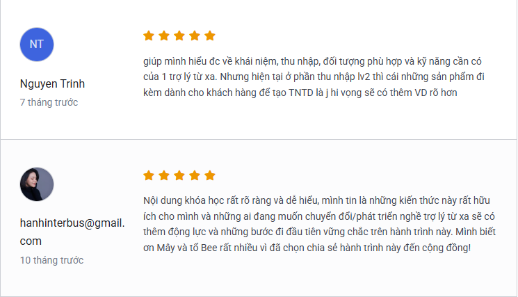 Khóa học Bee Academy đã giúp mình định hướng rõ ràng hơn về nghề trợ lý từ xa, đặc biệt là ngách trợ lý nội dung. Nhờ kiến thức và kỹ năng được học, mình tự tin hơn trong việc tìm kiếm khách hàng và làm việc chuyên nghiệp. Dù mất thời gian để có khách hàng đầu tiên, nhưng khóa học đã cho mình nền tảng vững chắc để theo đuổi công việc này lâu dài. Giờ đây, mình đã có thu nhập ổn định mỗi tháng và quan trọng hơn là thêm niềm tin vào năng lực của bản thân.
