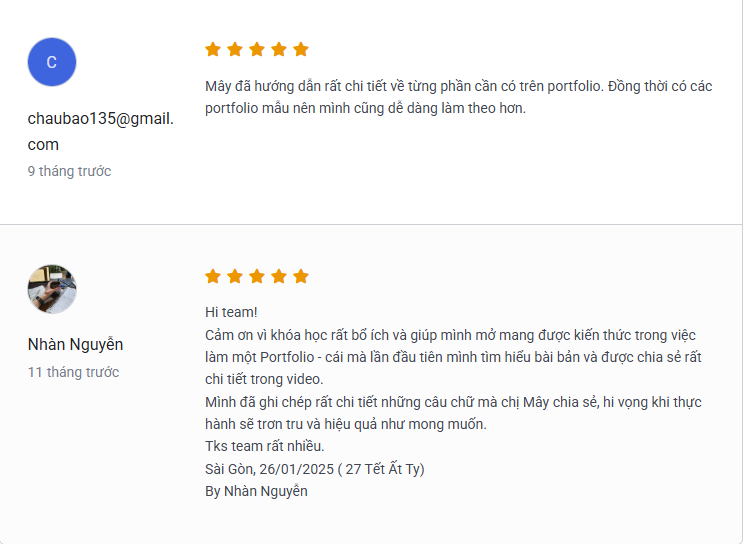 Có! Portfolio của bạn sẽ được mentor review và chấm điểm. Bạn còn nhận được 100.000đ thưởng nóng khi portfolio pass tiêu chuẩn.